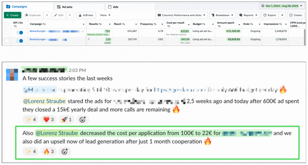 Short snapshots of how we turn ad spend into hires, clients, and profit.